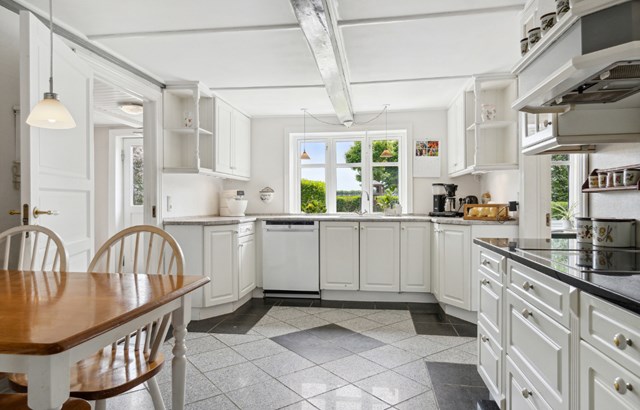 I stueplan er der entre med trappe til 1. sal, soveafdeling med soveværelse og 2 værelser, samt badeværelse med bruseniche, bryggers, fint landkøkken med adgang til viktualierum, hyggelig spisestue, kontor og skøn stue med trægulv og udgang til højloftet udestue/multirum med god udsigt over haven.